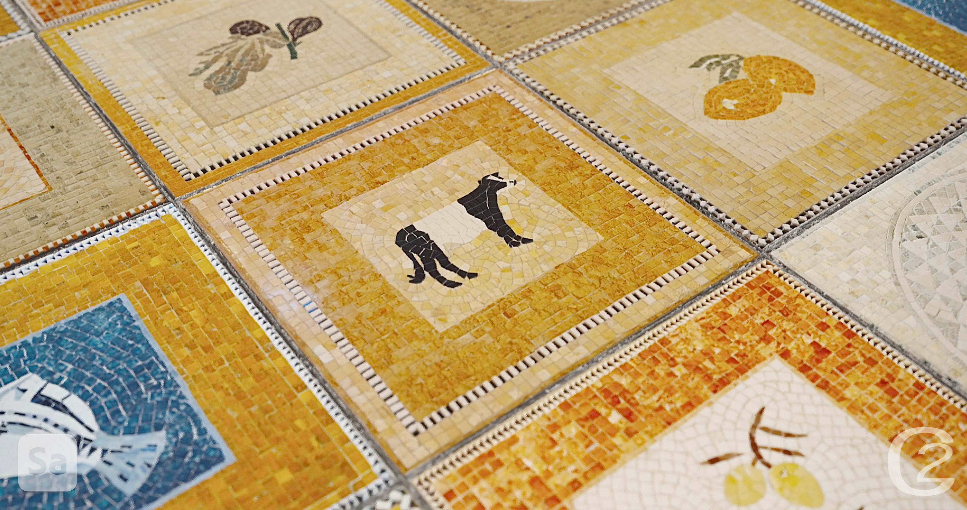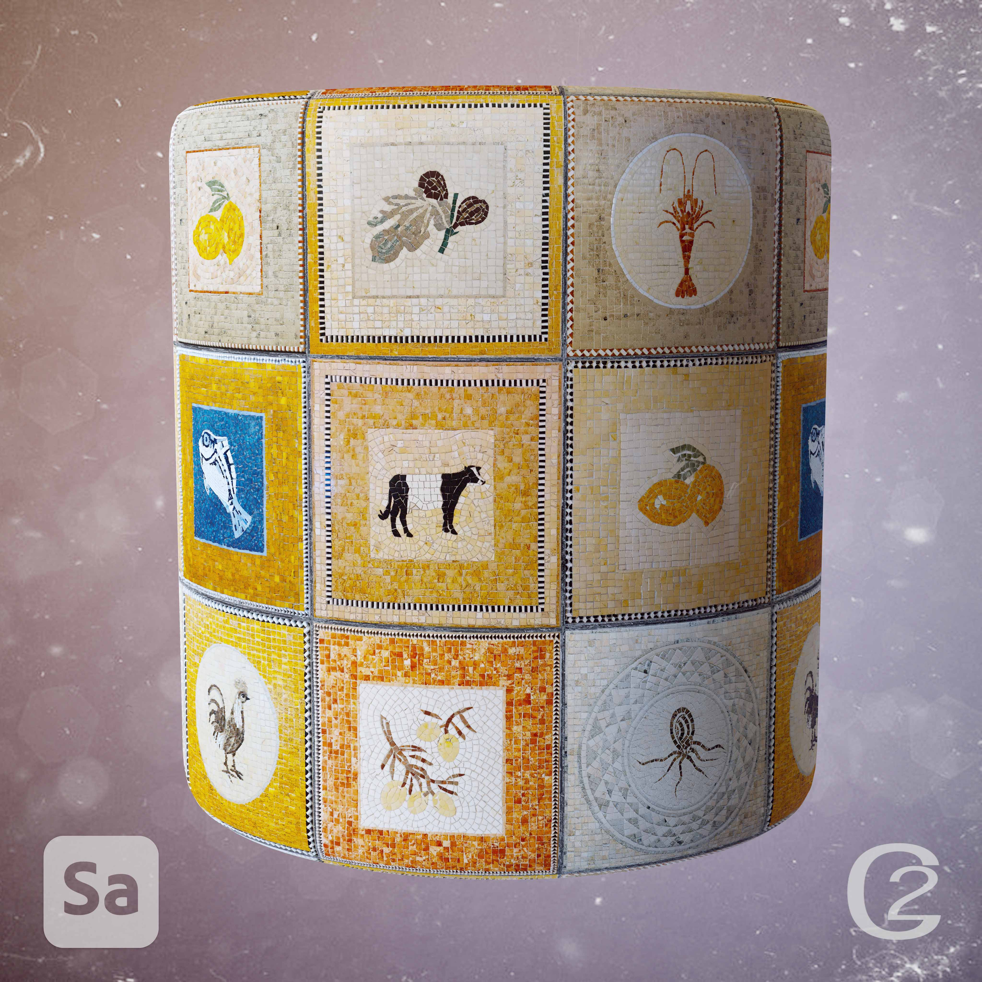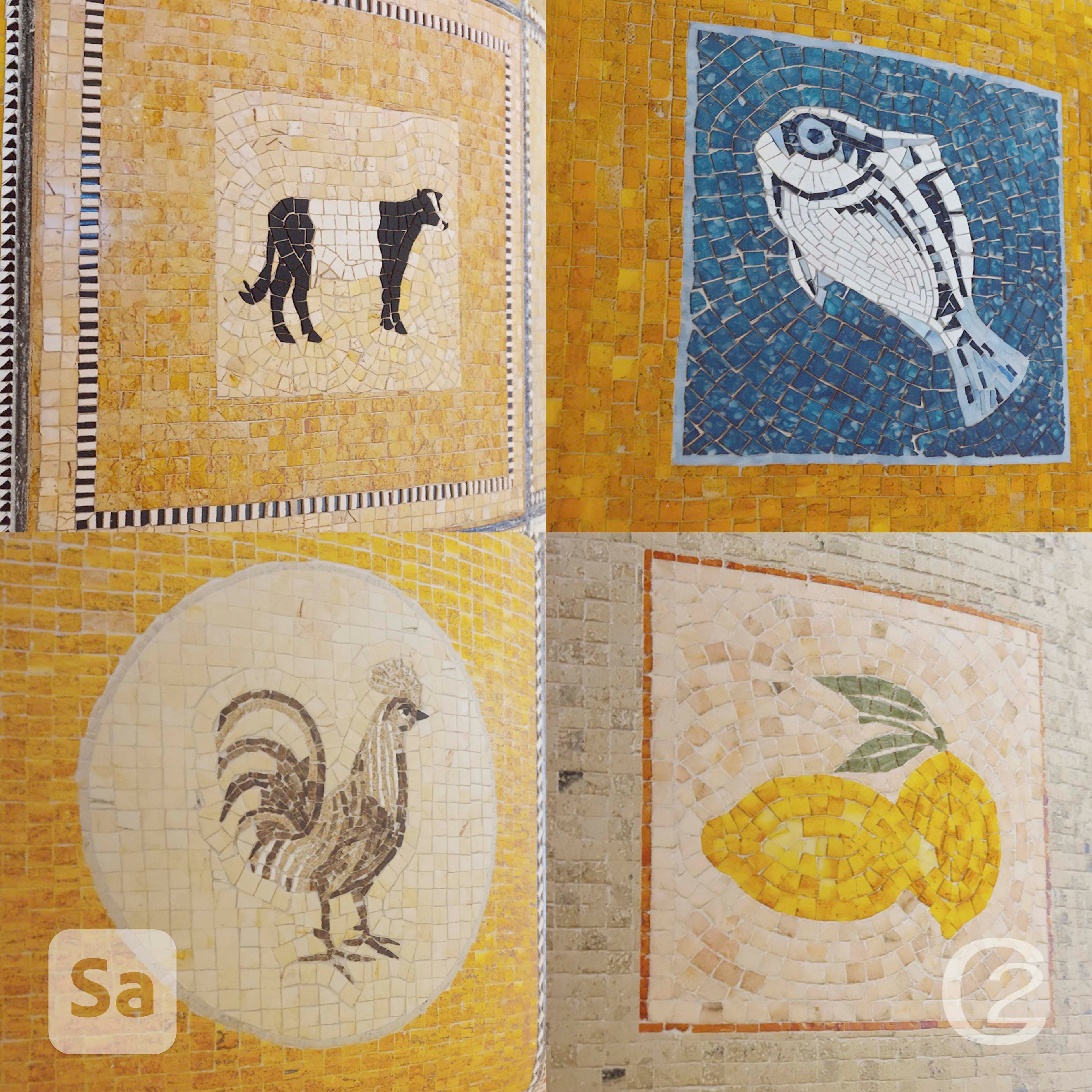 This material is based on the iconic decorative mosaic tiles found inside the San Francisco Ferry Building, featuring hand-laid stone tiles arranged into repeated framed motifs, animals, fruit, and geometric patterns embedded within a warm limestone and terracotta tile floor.